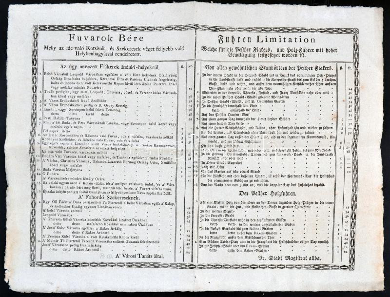Beschreibung: cca 1830-1840 Pest, Buda, A városi tanács által kiadott fuvardíjszabási tájékoztató, táblázat magyar és német nyelven