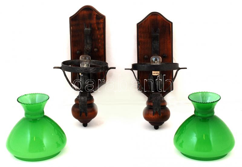 Beschreibung: 2 db régi fa és fém falikar, max. 40 W, 30×16×18 cm a hozzájuk tartozó zöld üvegbúrával, belső peremeinél apró lepattanásokkal
