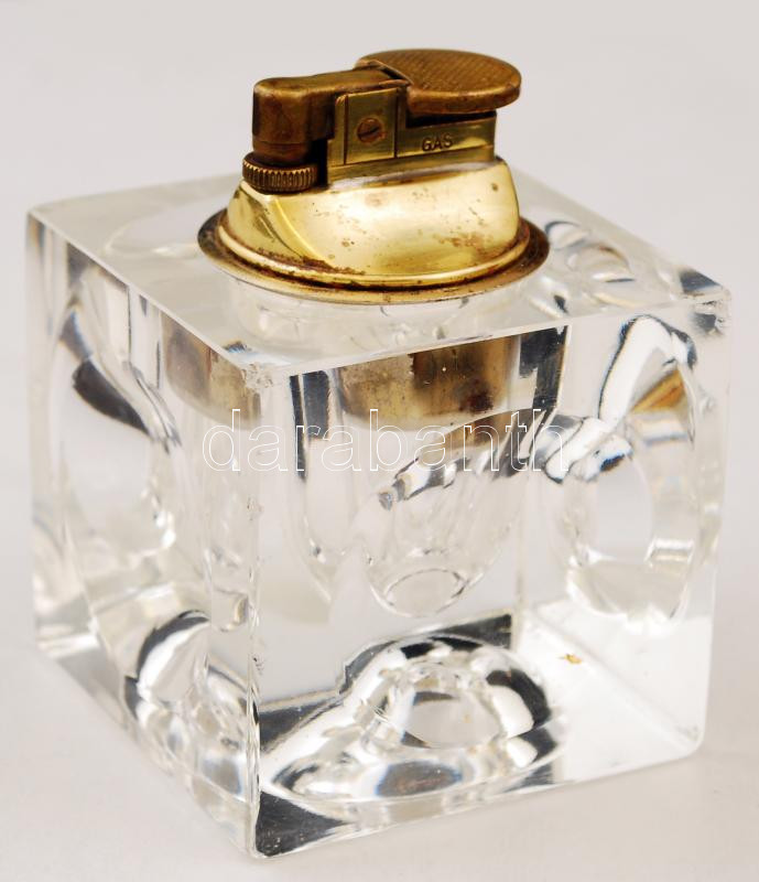 Beschreibung: Asztali öngyújtó, üveg-réz, üvegen csorbák, 7×7 cm