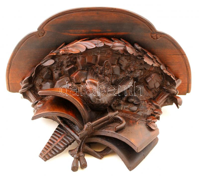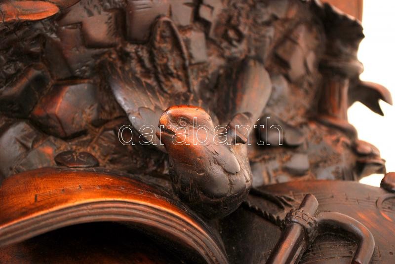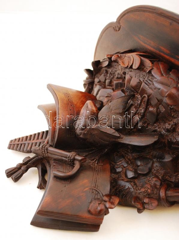 Beschreibung: Énekesmadár sziklapárkányon, díszesen faragott felakasztható fa posztamens, jelzés nélkül, apró sérüléssel, 44,5×23×27 cm