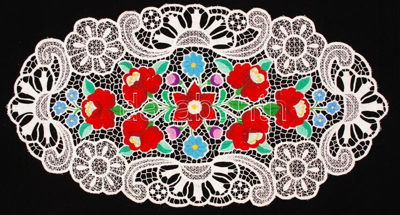 Beschreibung: Kalocsai mintás terítő, kézzel és géppel (riselin) hímzett, jó állapotban, 30×55 cm
