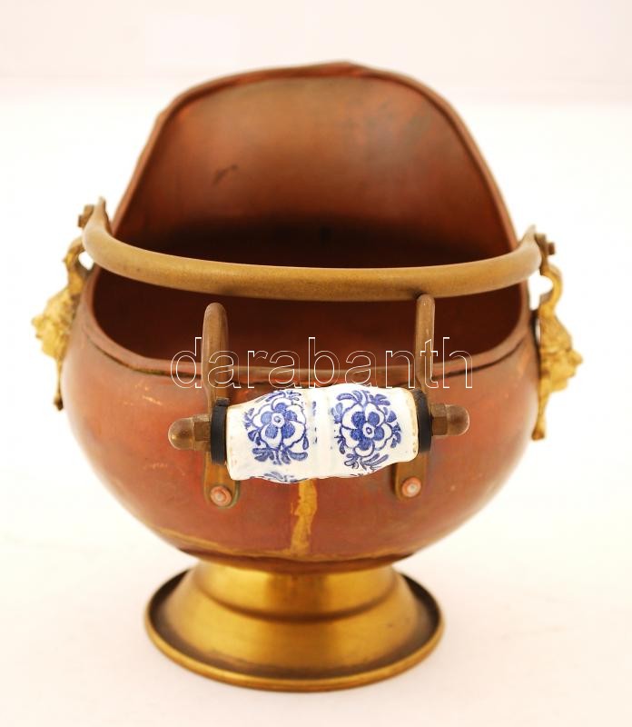 Beschreibung: Oroszlánfejekkel díszített réz kiöntő, porcelán fogantyúval, m: 14 cm