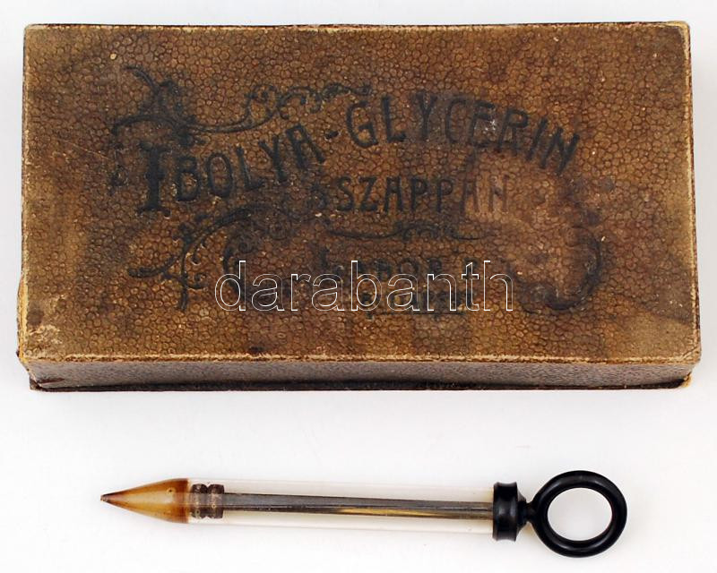 Régi fecskendő, "Ibolya glycerin szappan"-os dobozban, karton, kopott,... https://www.darabanth.com/de/224-Fernauktion/224.0/Andere-Sammelgebiete/Flohmarkt~21/Regi-fecskendo-Ibolya-glycerin-szappan-os-dobozban-karton-kopott-18C39710-cm~II979131