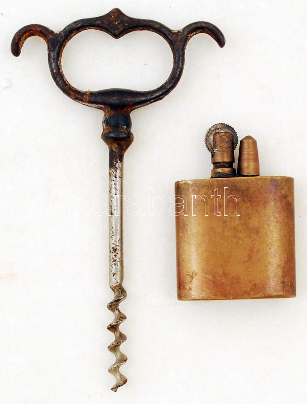 Régi fém dugóhúzó és réz öngyújtó, h: 6 és 13 cm https://www.darabanth.com/de/224-Fernauktion/224.0/Andere-Sammelgebiete/Flohmarkt~21/Regi-fem-dugohuzo-es-rez-ongyujto-h-6-es-13-cm~II981691