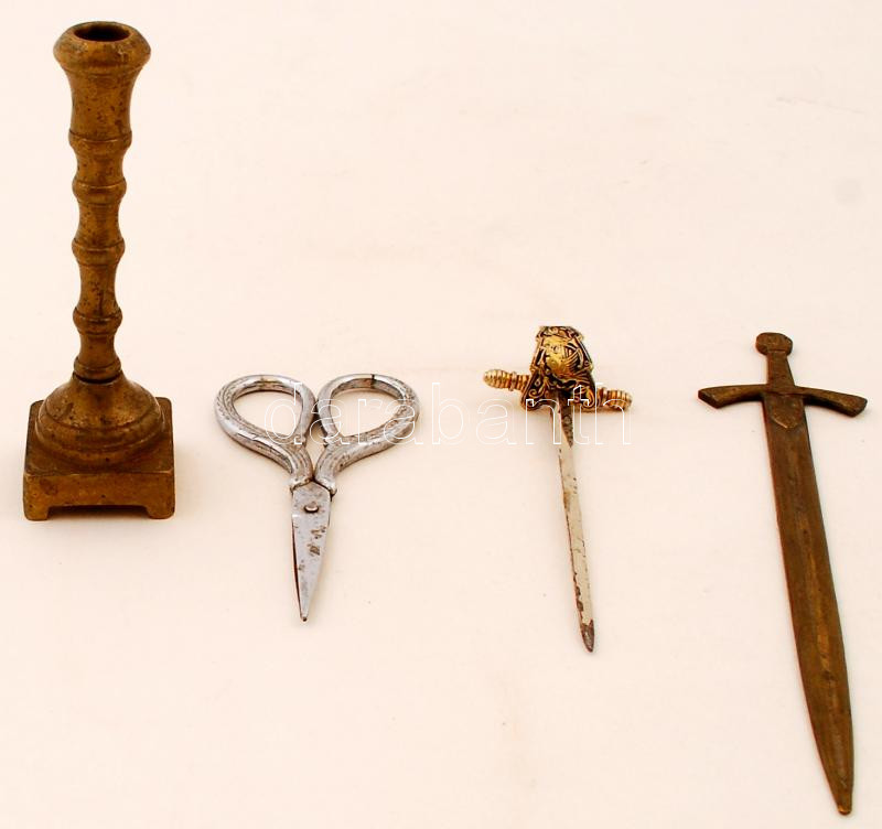 Vegyes bolha tétel: Régi, réz gyertyatartó, régi olló, 2 db papírvágó. https://www.darabanth.com/de/224-Fernauktion/224.0/Andere-Sammelgebiete/Flohmarkt~21/Vegyes-bolha-tetel-Regi-rez-gyertyatarto-regi-ollo-2-db-papirvago~II985612