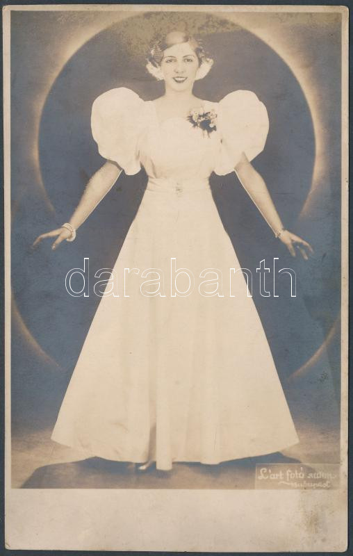 Beschreibung: cca 1930 L’art fotó szalon (Bp.) műtermi felvétele egy színpadhoz szokott bájos teremtésről, 18x11 cm