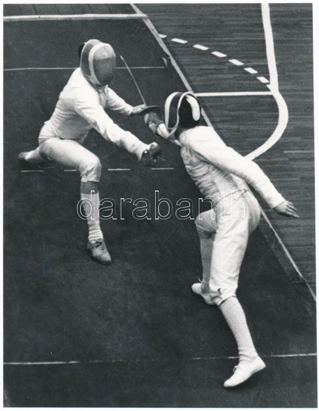 Beschreibung: cca 1965 Kardvívók a páston, Pézsa (magyar) és Chicca (olasz) párharca a Santelli Kupán, amit a magyarok nyertek el, sportfotó, 20x15 cm