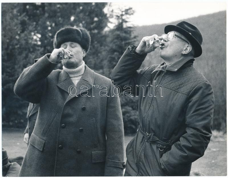 Beschreibung: cca 1975 Losonczi Pál (1919-2005) az Elnöki Tanács elnöke (1967-1987) vadászat előtt bedob egy felest, sajtófotó Helsinkiből, 17x21 cm