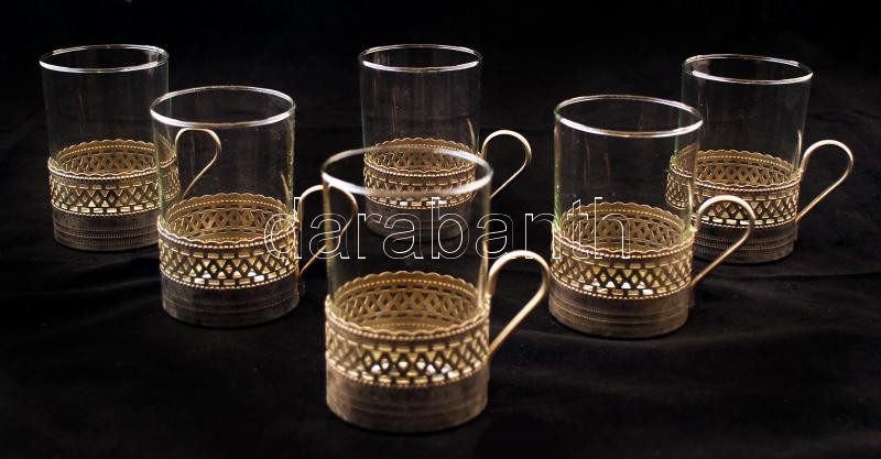 Beschreibung: 6 db üvegpohár, gazdagon díszített fém aljzattal, d: 6,5 cm, m: 10 cm