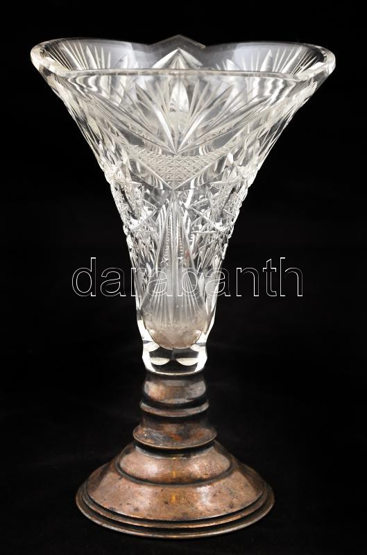 Beschreibung: Csiszolt üvegváza fém talppal, metszett, apró csorbával, m: 19 cm