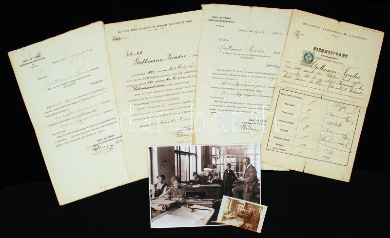 1897-1904 Guttmann Tivadarnak a Ganz gyár könyvelőjének 4 db fizetési papírja, rajta Mechwart András és Pallavicini aláírásával, 1 db fotóval, 10x6 cm és annak felnagyított másolatával