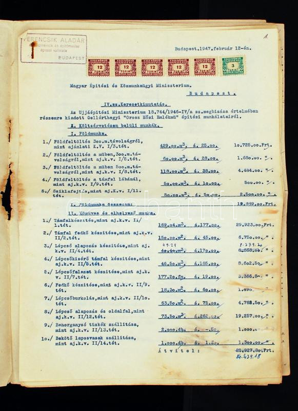 Beschreibung: 1947 Budapest, Gellérthegyi Orosz Hősi emlékmű keresetkimutatás, A Ferencsik építési vállalat dokumentzáció kb 10 lapon