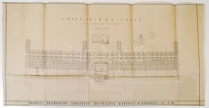 Az 1933-ban megnyitott kerepesi úti ügető (BÜE) I. oszt. tribün tervrajza (a tervező: ifj. Paulheim Ferenc). Tus, pauszpapír, hajtogatva. Jó állapotú. Rajzolt méret: 90x48 cm /