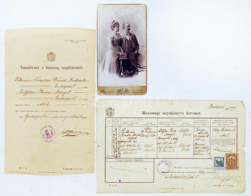 Beschreibung: 1919 Guttmann Tivadar, a Ganz gyár könyvelőjének házassági anyakönyvi kivonata, és feleségével közös fotója