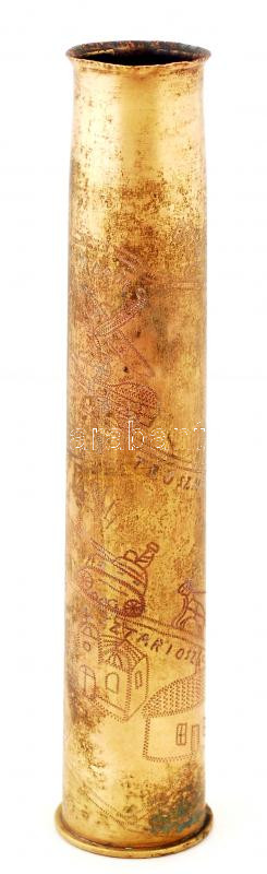 Beschreibung: cca 1943-1944 Gazdagon díszített réz töltényhüvely váza a II. világháború idejéből, a keleti frontról, kissé kopott, d: 4 cm, m: 25 cm