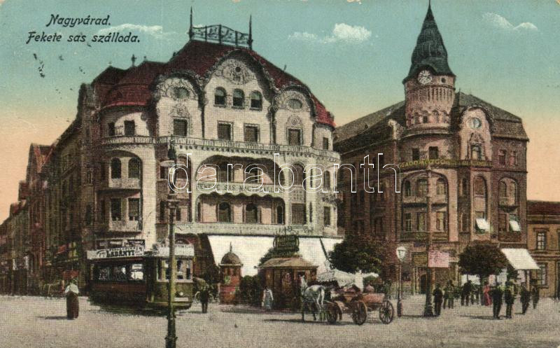 Nagyvárad, Fekete Sas szálloda, villamos, Vigadó Mozgó / hotel, tram https://www.darabanth.com/de/224-Fernauktion/224.0/Ansichtskarten/Siebenburgen~10007/Nagyvarad-Fekete-Sas-szalloda-villamos-Vigado-Mozgo-hotel-tram~II978165