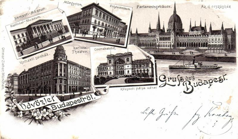 Beschreibung: 1897 Budapest, Nemzeti színház és múzeum, Műegyetem, Központi pályaudvar, gőzhajó, Ottmar Zieher floral Art Nouveau litho (Rb)