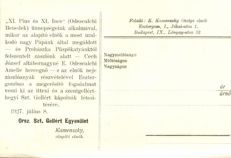 Beschreibung: Esztergom, Országos Szent Gellért Egyesület a leendő Szent Gellért kápolna előtt, hátoldalon Kamenszky alapító levele (EK)