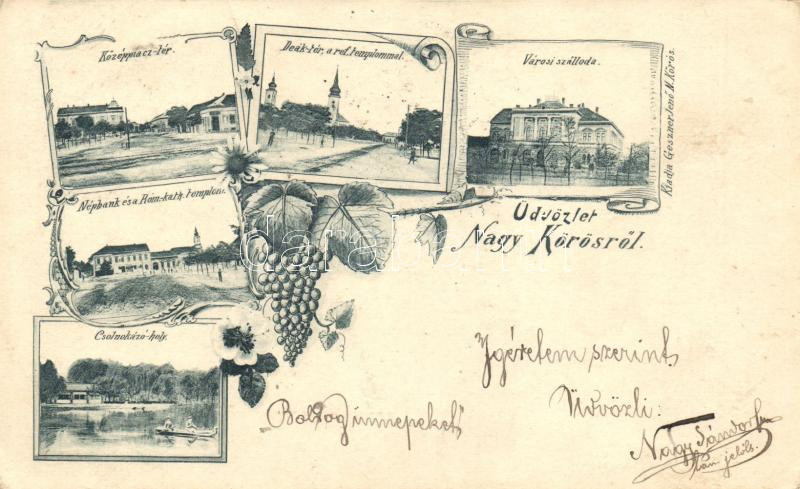 Beschreibung: Nagykőrös, Közép piac tér, Városi szálloda, Deák tér, Népbank, szőlő, kiadja Geszner Jenő, floral Art Nouveau (EK)