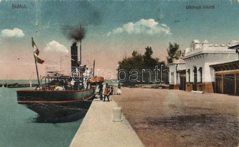 Beschreibung: Siófok, gőzhajó kikötő, Divald és Monostory (fa)