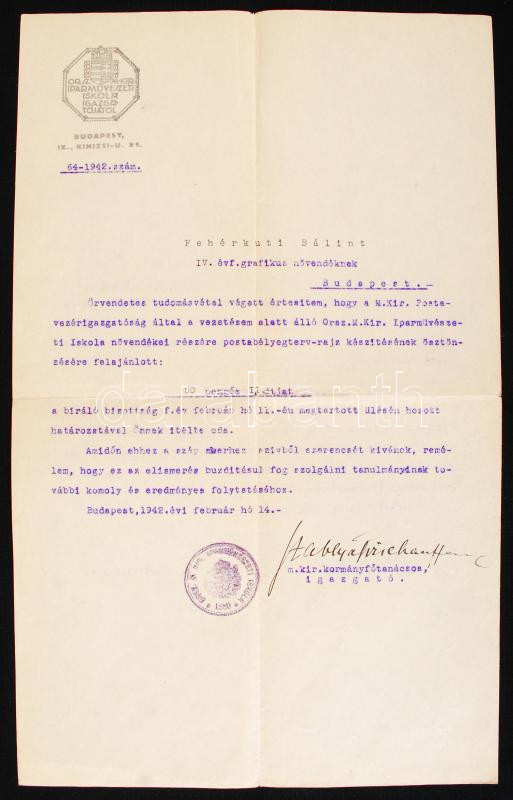 1942 Az Országos Iparművészeti Iskola igazgatója értesíti FEFÉRKÚTI Bálint grafikus növendéket, hogy az iskola postabélyegterv-rajz készítésének ösztönzésére felajánlott II. díjat elnyerte.