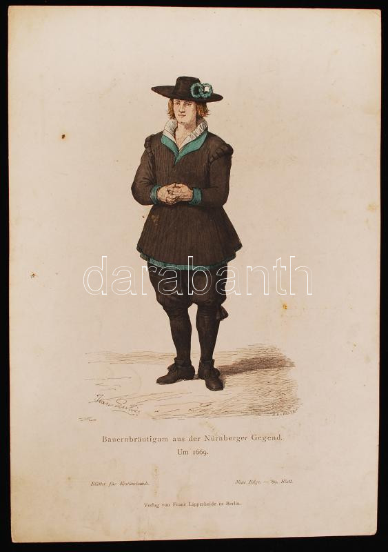 1887 Bauernbrautigam aus Nürnberg Gegend. Um 1669. Színezett fametszet a Blatter für Kostumkunde c. könyvből. Jelzett a metszeten. 28,5x20cm / Peasant groom from area of Nunberg. About 1669. Colored wood engraving. Signed on the engraving.