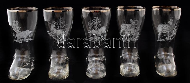 Beschreibung: 5 db csizma alakú üvegpohár vadászjelenetes díszítéssel