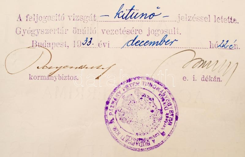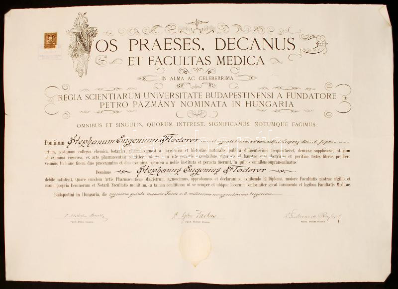 Beschreibung: 1930 Flóderer István gyógyszerész, okmánybélyeg szakíró gyógyszerészi diplomája.