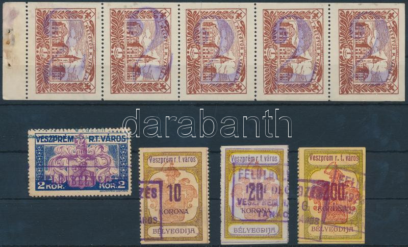 Beschreibung: 4 klf veszprémi illetékbélyeg + mezőtúri ötöscsík