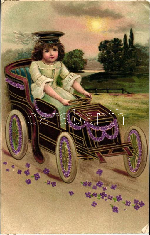 Beschreibung: Girl in automobile, Emb. litho (EK)