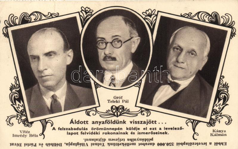 Vitéz Imrédy Béla, gróf Teleki Pál, Kánya Kálmán, on the back side: Magyarország nagy örömünnepe, vissza So. Stpl (fa)
