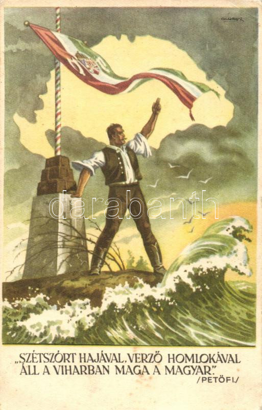 "Szétszórt hajával, vérző homlokával áll a viharban maga a magyar." /Petőfi/ kiadja az Ereklyés Országzászló Nagybizottsága / Hungarian irredenta s: Lamoss (EK)