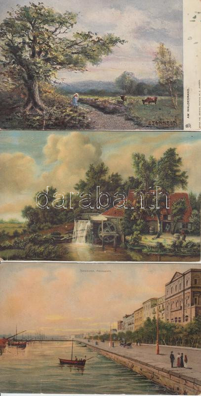 3 db régi művészlap, az egyik a szicíliai Siracusaról, pinx. M Hobbema, S. Johnson / 3 artist cards, one of them about Siracusa, pinx. M Hobbema, S. Johnson
