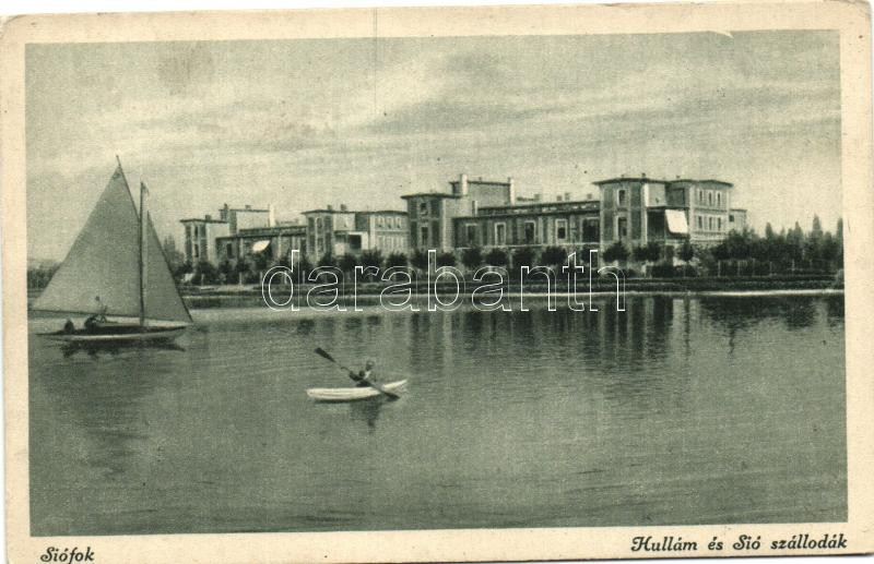 Siófok, Hullám és Sió szállodák, csónak, vitorlás hajó (EK) https://www.darabanth.com/de/225-Fernauktion/225.0/Ansichtskarten/Ungarn~300010/Siofok-Hullam-es-Sio-szallodak-csonak-vitorlas-hajo-EK~II913929