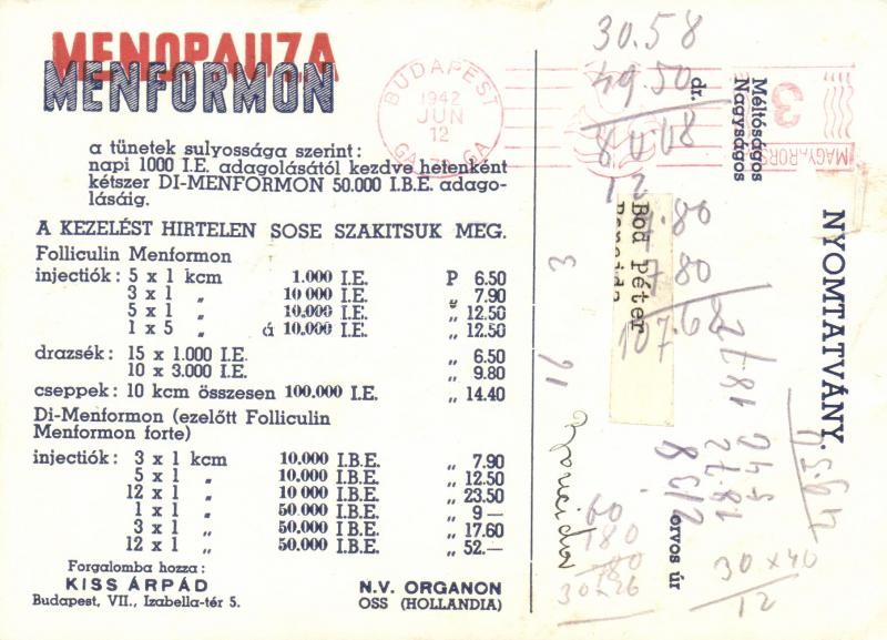 Menformon, hormonális zavarokra, reklám / medicine advertisement (11.5... https://www.darabanth.com/de/225-Fernauktion/225.0/Ansichtskarten/Werbungen~1200456/Menformon-hormonalis-zavarokra-reklam-medicine-advertisement-115-x-155-cm-fa~II987037