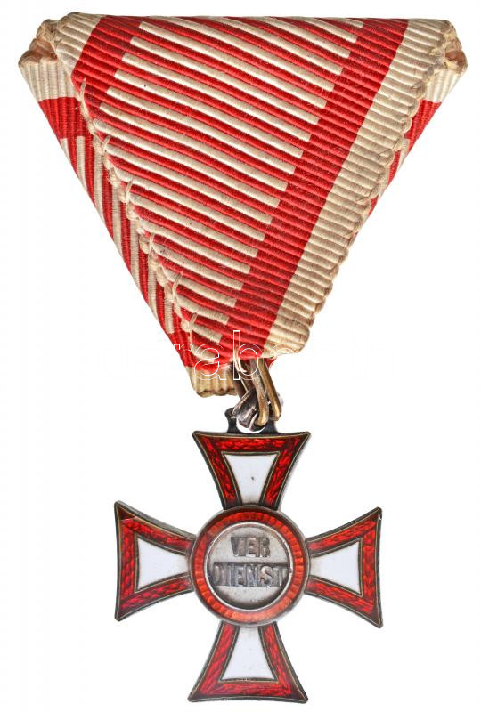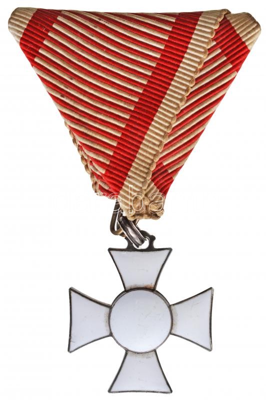 Hungary 1870- "Military Merit Cross" enamelled, hallmarked Ag decoration on ribbon, bended fixing strap in the ribbon C:XF,VF small enamel error