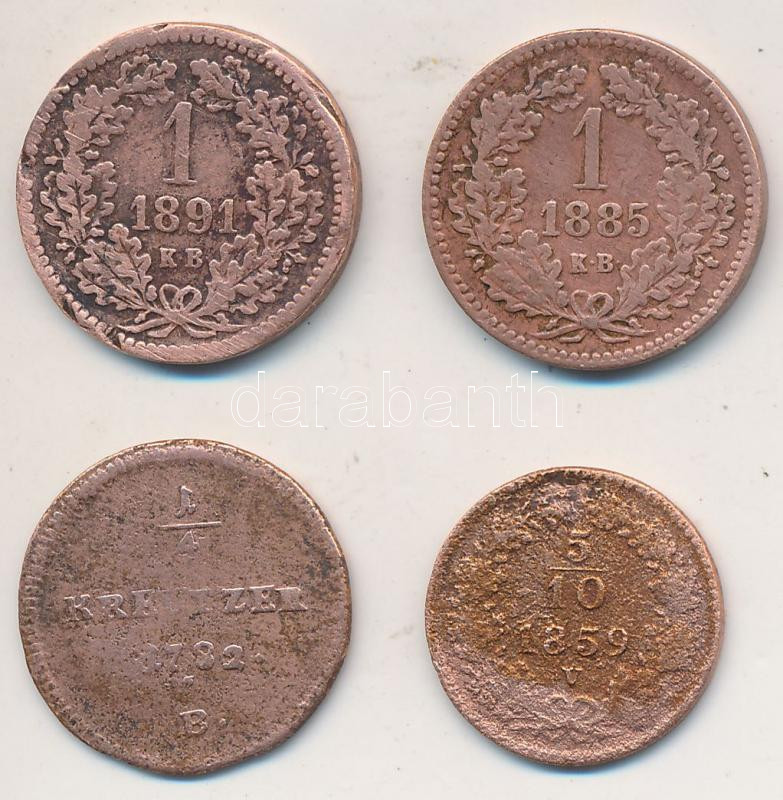 1782B 1/4Kr Cu + 1859V 5/10Kr Cu + 1885KB 1Kr Cu + 1891KB 1Kr Cu T:2-,... https://www.darabanth.com/de/225-Fernauktion/225.0/Numismatik/Ungarische-Munzen~54/1782B-14Kr-Cu-plus-1859V-510Kr-Cu-plus-1885KB-1Kr-Cu-plus-1891KB-1Kr-Cu-T2-3-3-~II986528