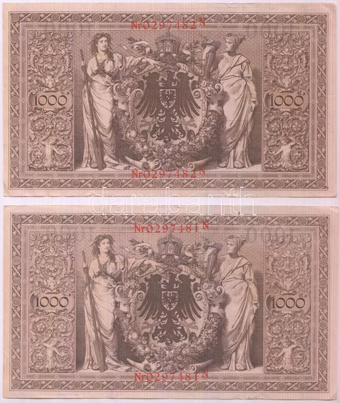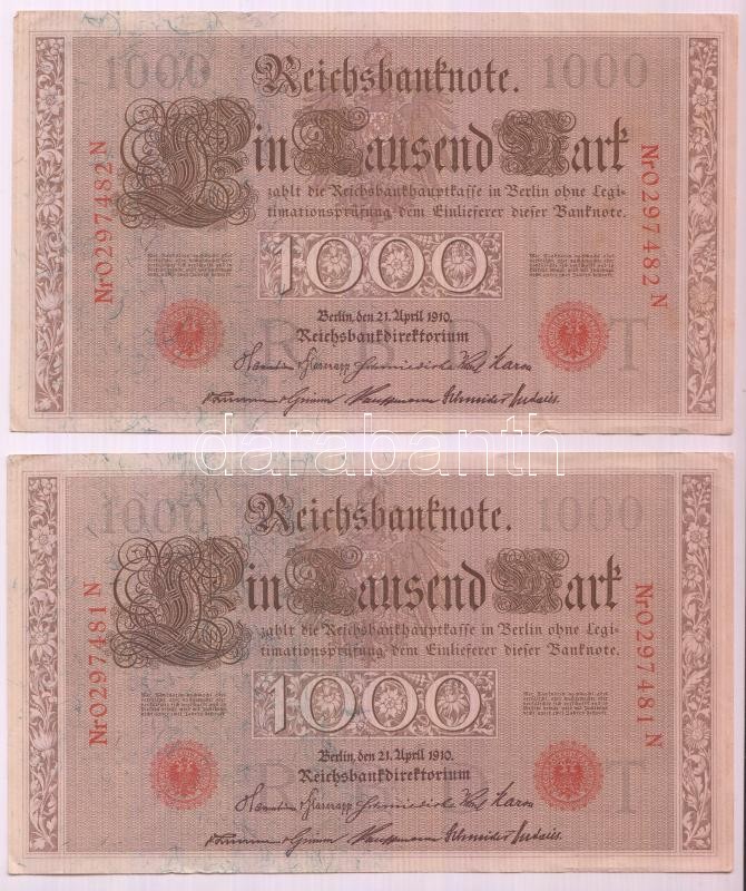 Német Birodalom 1910. 1000M (2x) hétjegyű sorszám, piros pecséttel, sorszámkövetők T:II-,III