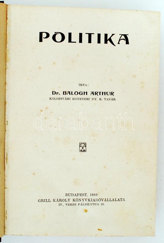 Dr. Balogh Arthur: Politika. Bp., 1910, Grill Károly Könyvkiadóvállalata. Félvászon kötés, lapok foltosak, grafitceruzás bejegyzésekkel, egyébként jó állapotban.