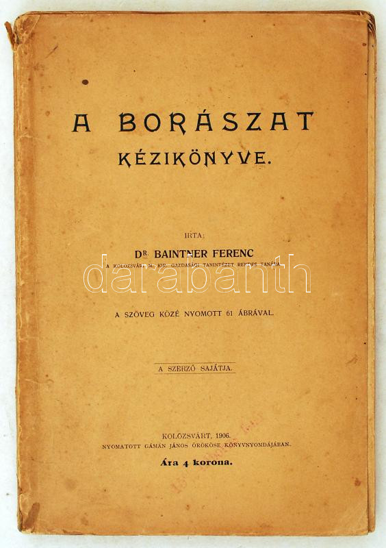 Bainter Ferenc: A borászat kézikönyve. Kolozsvár, 1906. Kicsit szakado... https://www.darabanth.com/de/226-Fernauktion/226.0/Andere-Sammelgebiete/Bucher-Kuche-und-Garten~400009/Bainter-Ferenc-A-boraszat-kezikonyve-Kolozsvar-1906-Kicsit-szakadozott-papirkotesben-egy~II1000067