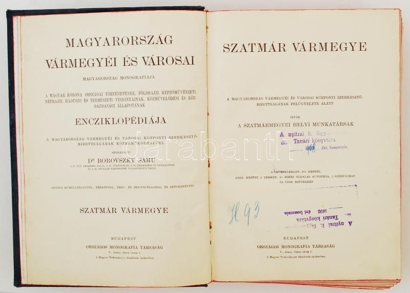 Dr. Borovszky Samu(szerk.): Magyarország vármegyéi és városai, Magyarország monográfiája. Szatmár vármegye és Szatmár- Németi. 81 oldal műmelléklet, 2 színnyomat, 43 egész oldalas autotipia, és több szövegkép. Bp., (1908), Országos Monográfia Társaság. Kiadói aranyozott, festett, dombornyomott egészvászon kötés, színezett lapszélek, fedőlap,gerinc ill., sarkok kissé viseltes állapotban.