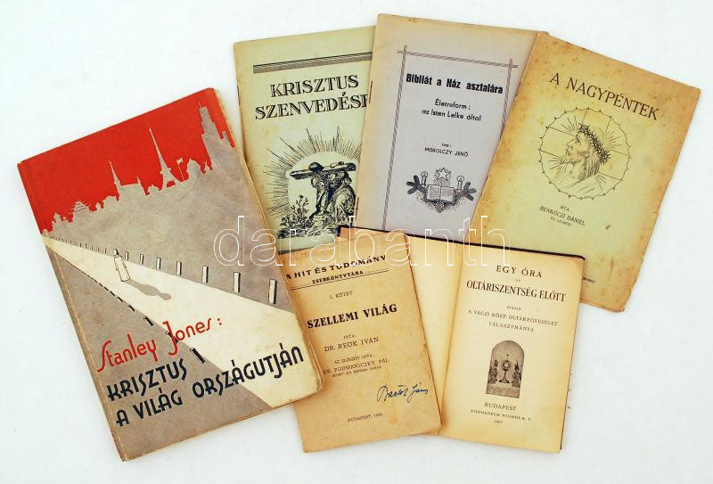 6 db vallási tematikájú könyv és kisebb kiadvány: Stanley, Jones: Krisztus a világ országútján. The Christ of Every ROad. (Tanulmány a pünkösdről). Győr, 1933, vitéz Szabó és Uzsaly.; Egy óra az Oltáriszentség előtt. Bp., 1907, Stephanaeum.; Reök István: A szellemi világ. Bp., 1948.; Benkóczi Dániel: A Nagypéntek. Bp., 1934, Battonyai Evangélikus Nőegylet.; Miskolczy Jenő: Bibliát a Ház asztalára. Bp., 1940.; White, E. G.: Krisztus szenvedései. Bp., é. n., Vallásos Iratok Nemzetközi Kiadóhivatala.