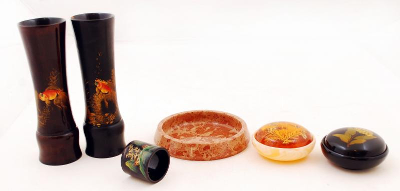 Beschreibung: 2 db kis fa váza távol keleti motívumokkal, lakk szalvétagyűrű, 2 db ékszertartó dobozka, asztali dísztál, összesen: 6 db