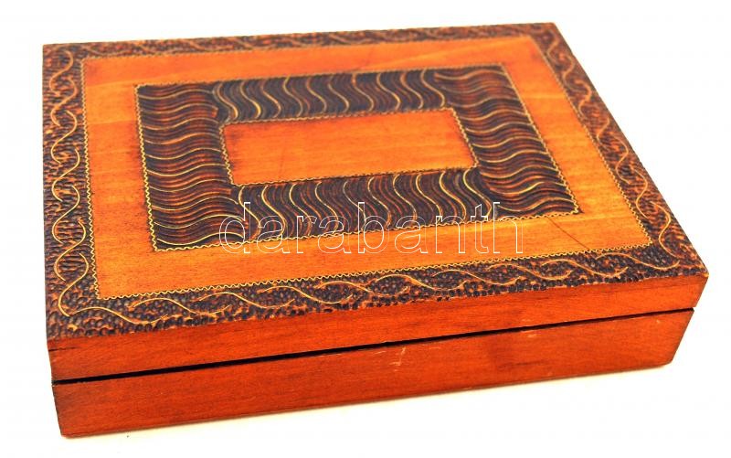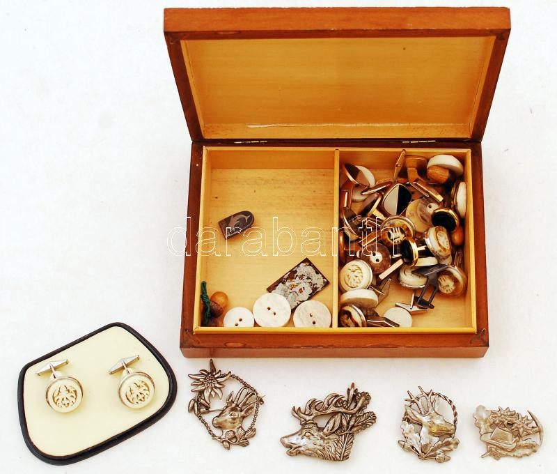 Beschreibung: Fa dobozka, benne kitűzőkkel, gombokkal, agancsból, mandzsettagombokkal