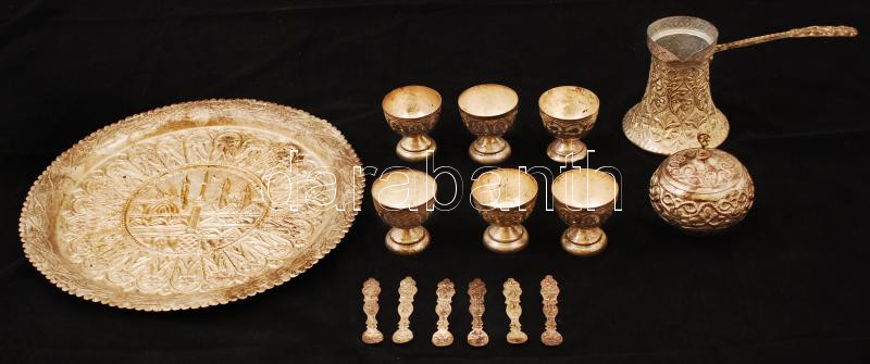 Beschreibung: Török, fém kávékínáló készlet indamintás díszítéssel
