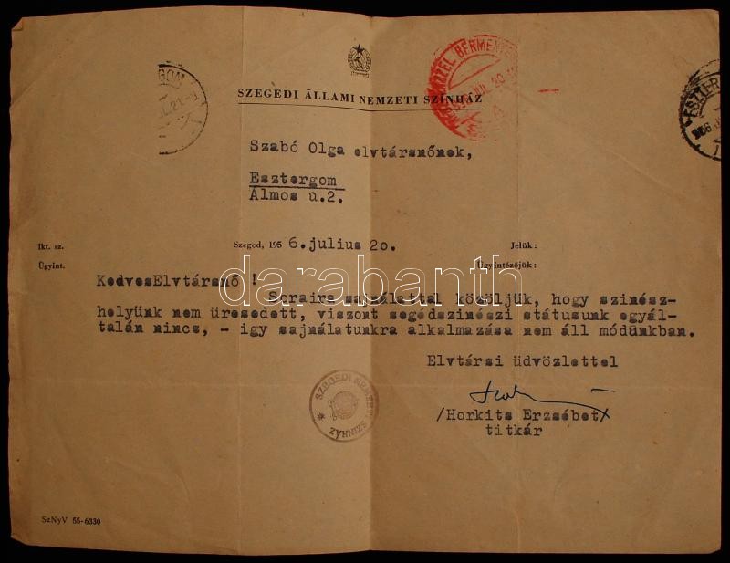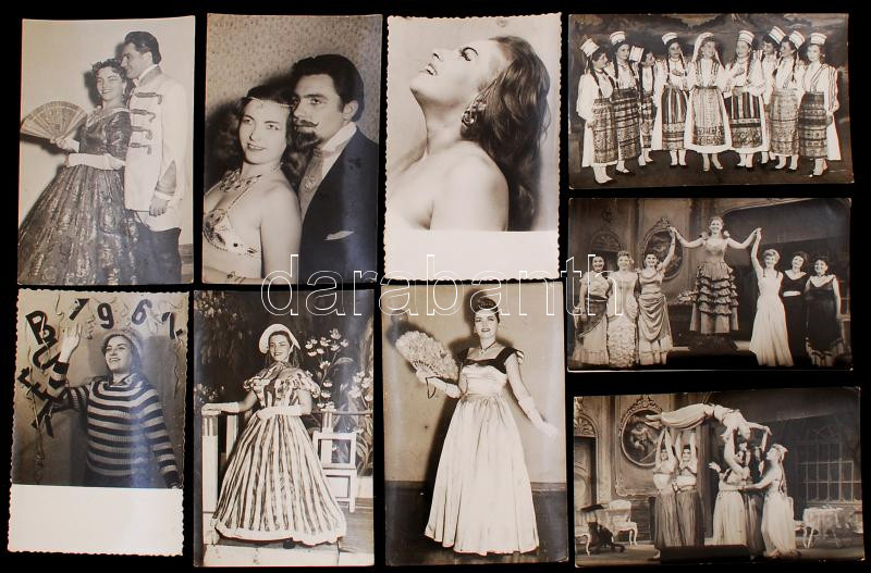 Beschreibung: cca 1958 Szabó Olga színésznőről készült fotók, 15 db, több közülük hátoldalán feliratozva, 1 db neki szóló levél, 9x14 cm