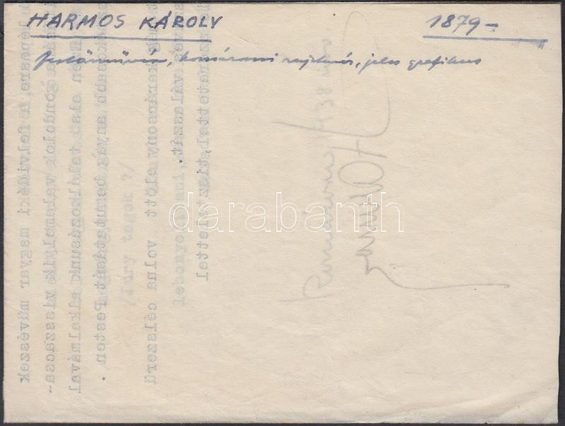 Harmos Károly (1879-1956) festőművész, grafikus aláírása általa géppel írt, a visszacsatolás után a felvidéki magyar művészek megváltozott helyzetét taglaló levélen