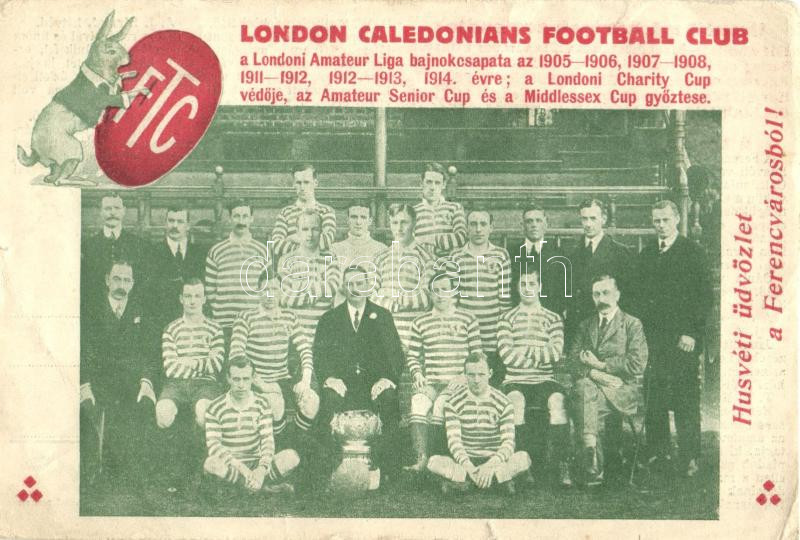 Húsvéti üdvözlet a Ferencvárosból! hátoldalon mérkőzések és csapattagok információi / London Caledonians Football Club, Matches and team informations on the backside (b)