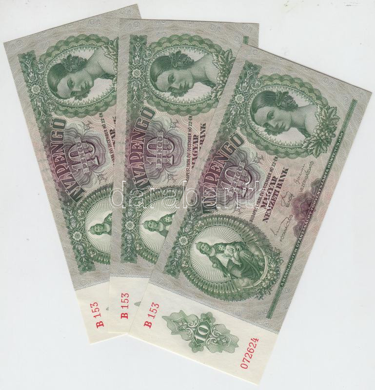 1936. 10P (3x) Egymást követő sorszámmal T:I https://www.darabanth.com/de/226-Fernauktion/226.0/Numismatik/Ungarische-Banknoten~9/1936-10P-3x-Egymast-koveto-sorszammal-TI~II951429
