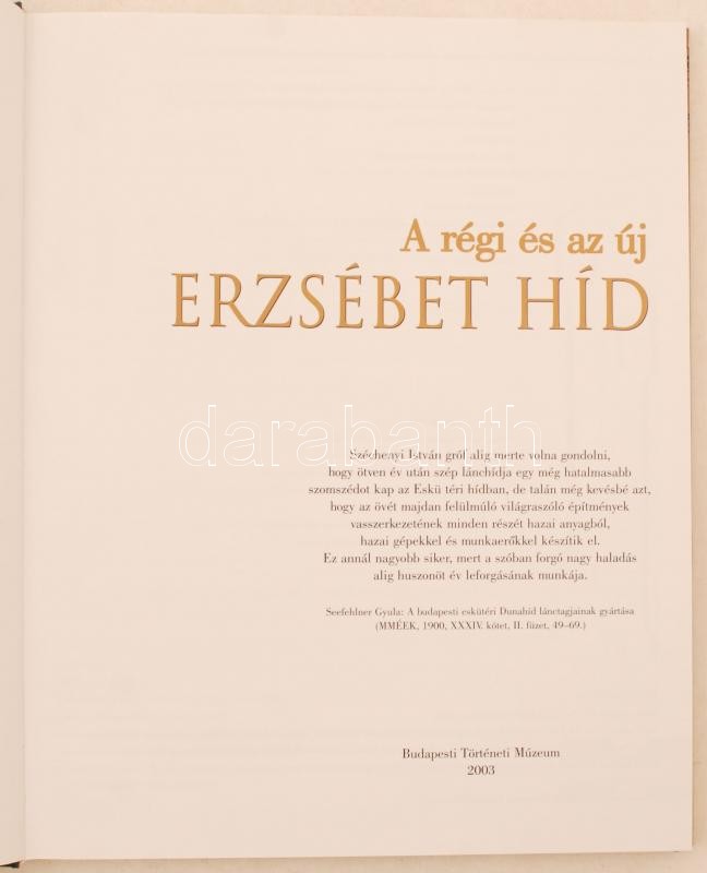 A régi és az új Erzsébet híd. Szerk.: Földi András, Hegyiné Déri Erzsébet, F. Dózsa Katalin. Bp., 2003, Budapesti Történeti Múzeum. Kartonált papírkötésben, jó állapotban.